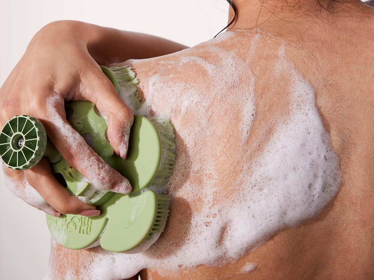 Traditional scrubbers, such as rough washcloths, plastic loofahs, and poufs, may not be best suited for people with skin concerns. Smoosh Body scrubber, crafted from finely-tuned silicone bristles, offers a gentle exfoliation experience making it suitable for individuals with acne-prone skin. And the embedded bar soap ensure that all parts of the body get an effective cleanse. For those tough to reach places, like the back, Smoosh Stick ensures that you address common areas for body acne.